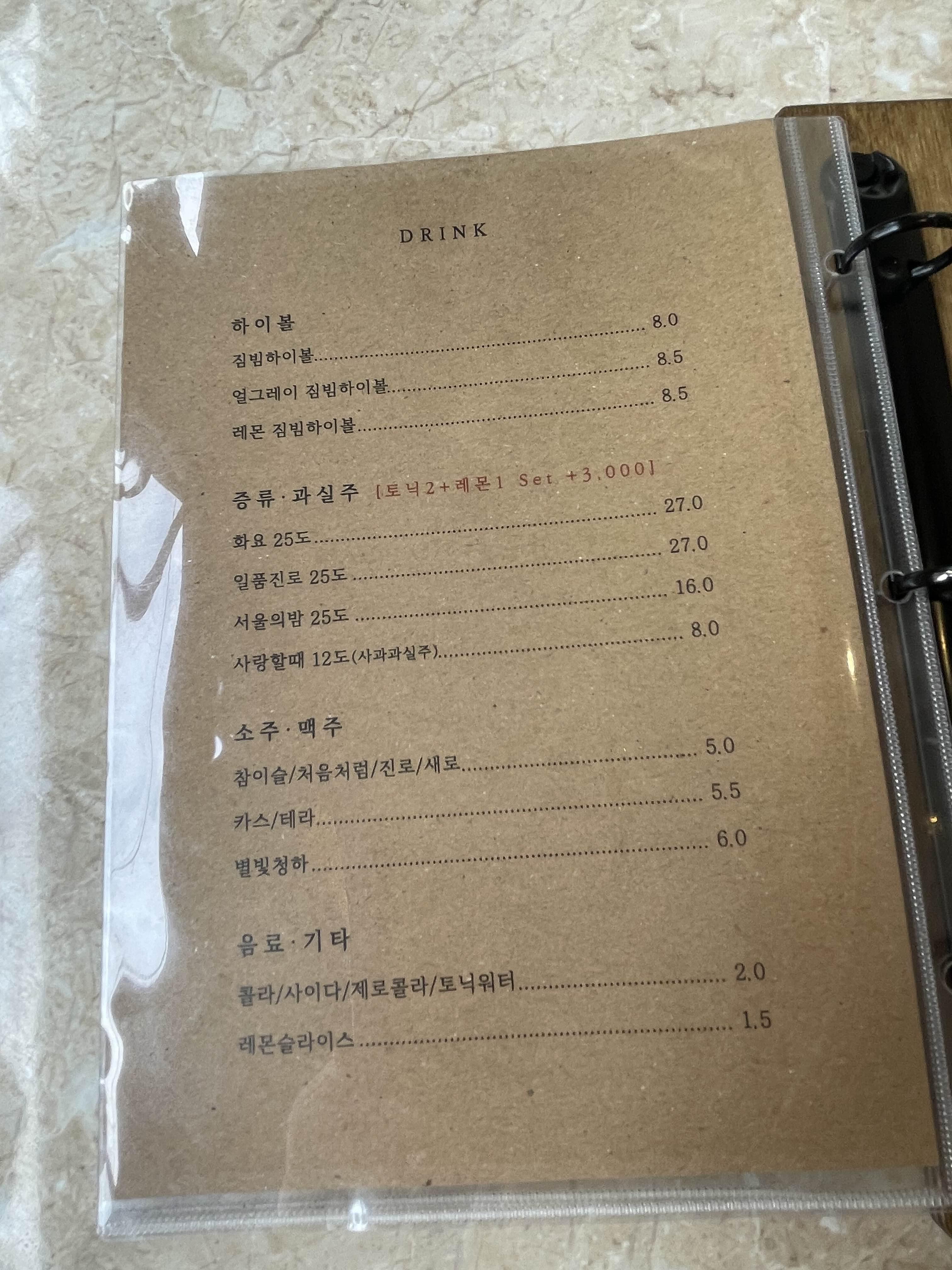저희는 미나리오리불고기 1인분 200g 16,000원 2개와 짐빔하이볼 8,000원 한 잔을 시켜 늦은 점심식사를 시작했습니다.