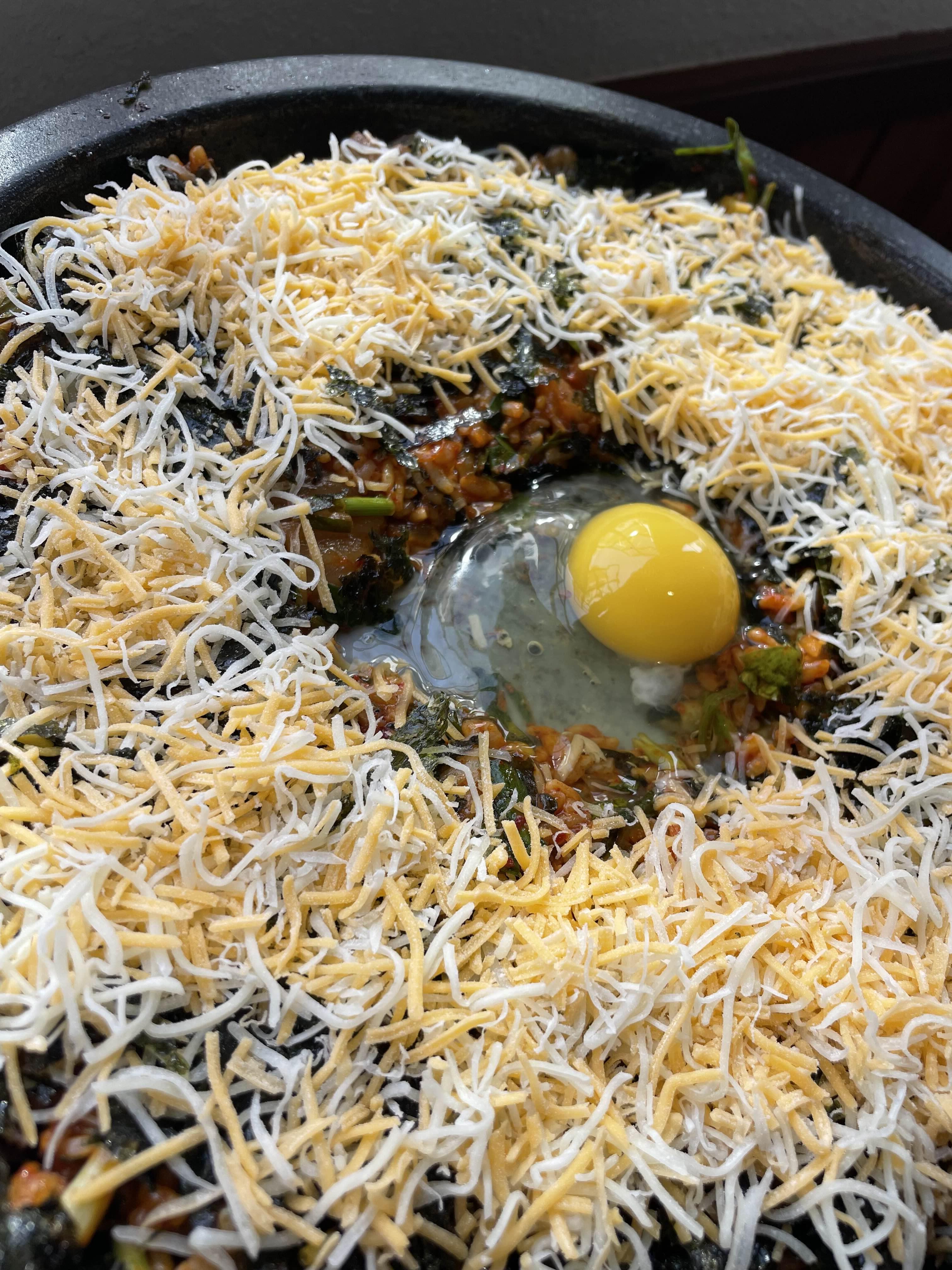 밥이 타기 전에 뒤집어서 치즈가 골고루 섞이도록 비벼주었습니다. 오리고기 기름은 몸에 좋다고하잖아요. 그 기름과 밥의 조합이라니 정말 맛있었습니다.