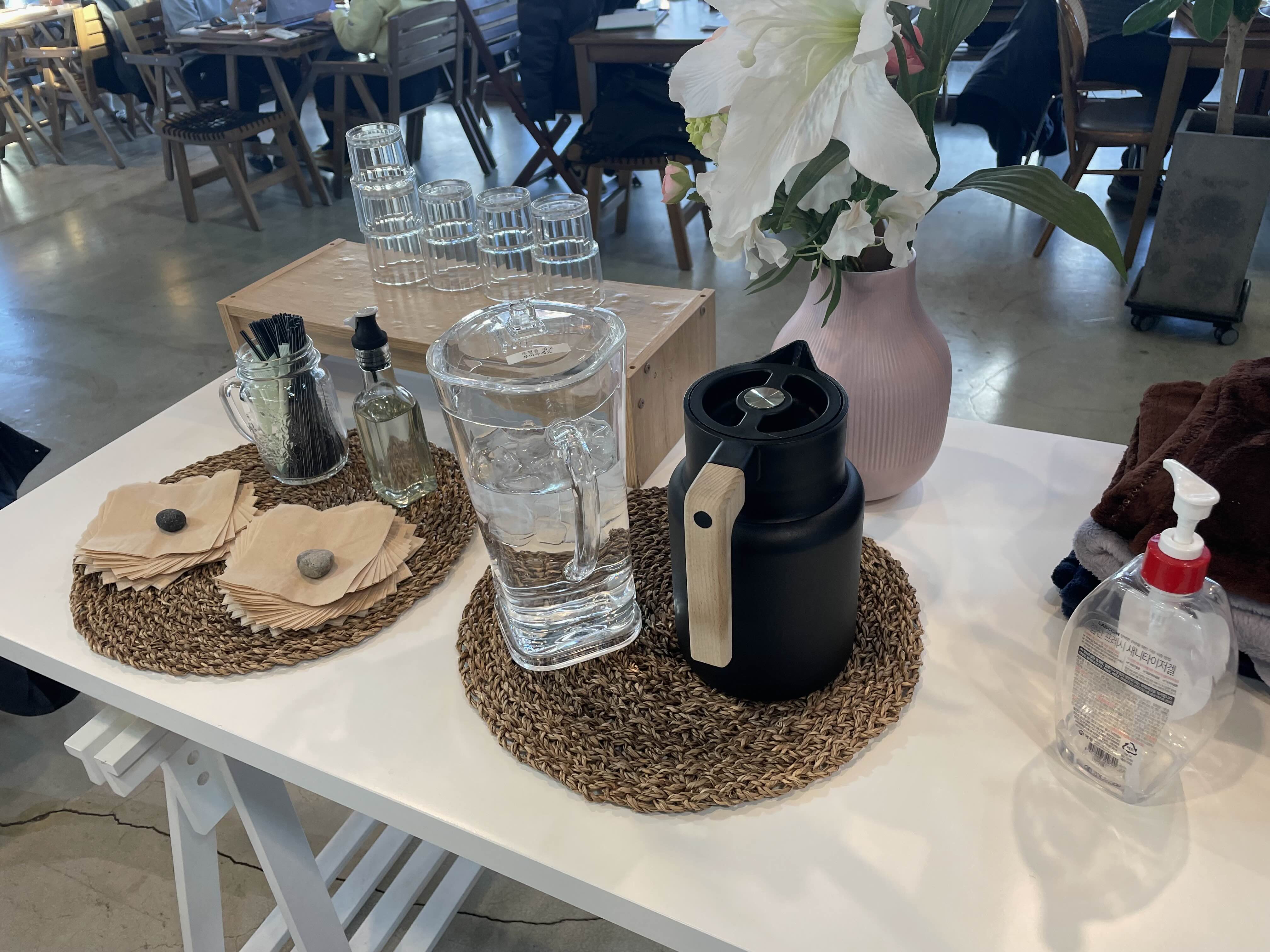 물이나 티슈같은 것들도 깔끔하게 정리되어있었고 인테리어 소품을 활용하여 카페를 잘 꾸미신거 같았습니다.
